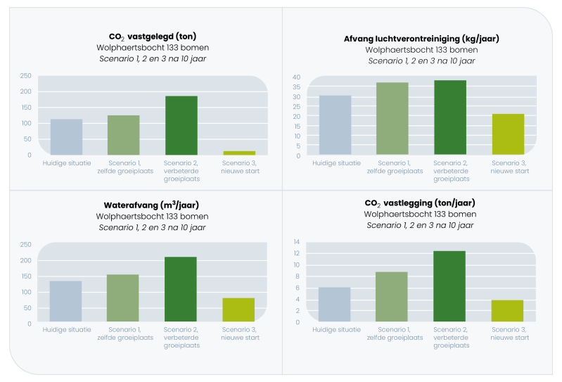 Het doorrekenen van verschillende scenario’s geeft snel inzicht in de (toekomstige) baten van bomen in verschillende scenario’s. Onder andere het investeren in groeiplaatsverbetering heeft een positief effect op de ecosysteemdiensten die de bomen leveren.